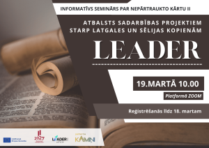 Aicinām piedalīties tiešsaistes informatīvajā seminārā par LEADER nepārtraukto kārtu II! Seminārā iepazīstināsim ar aktualitātēm, izstāstīsim svarīgākās lietas un atbildēsim uz jautājumiem par rīcību "Atbalsts sadarbības projektiem starp Latgales un Sēlijas kopienām" Reģistrējies līdz 18. martam šeit: https://ej.uz/macibuprojektileader Lasīt vairāk.....Publicēts : 11.marts.2026