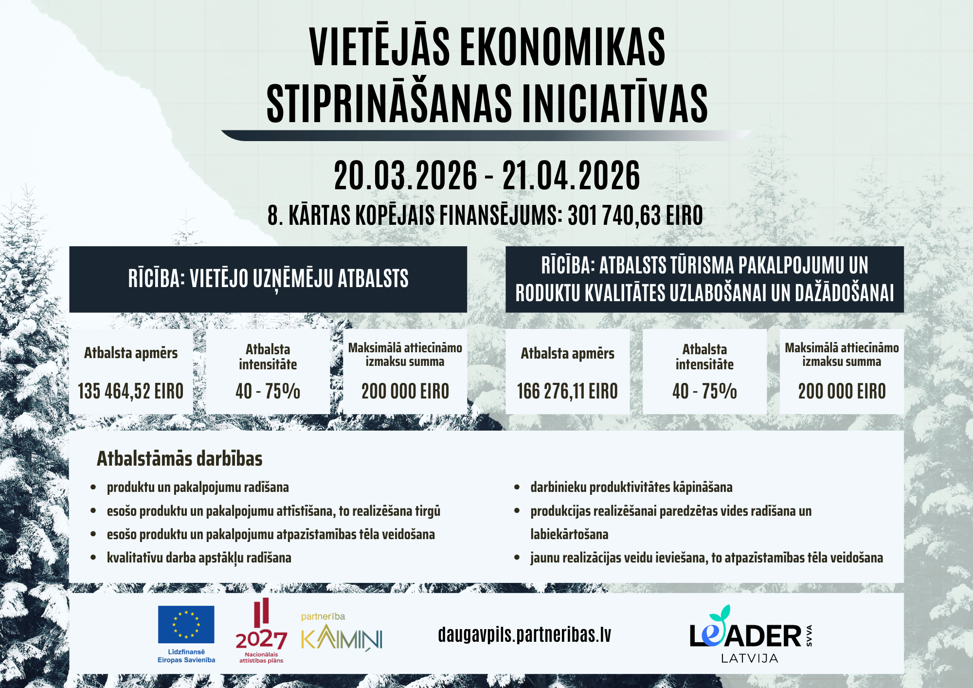 Biedrība “Partnerība “Kaimiņi”” izsludina atklātu projektu iesniegumu pieņemšanas 8.kārtu Eiropas Savienības Eiropas Lauksaimniecības fonda lauku attīstībai Kopējās lauksaimniecības politikas stratēģiskā plāna 2023. – 2027.gadam intervences LA19 “Darbību īstenošana saskaņā ar sabiedrības virzītas vietējās attīstības stratēģiju, tostarp sadarbības aktivitātes un to sagatavošana” aktivitātē “Vietējās ekonomikas stiprināšanas iniciatīvas”.